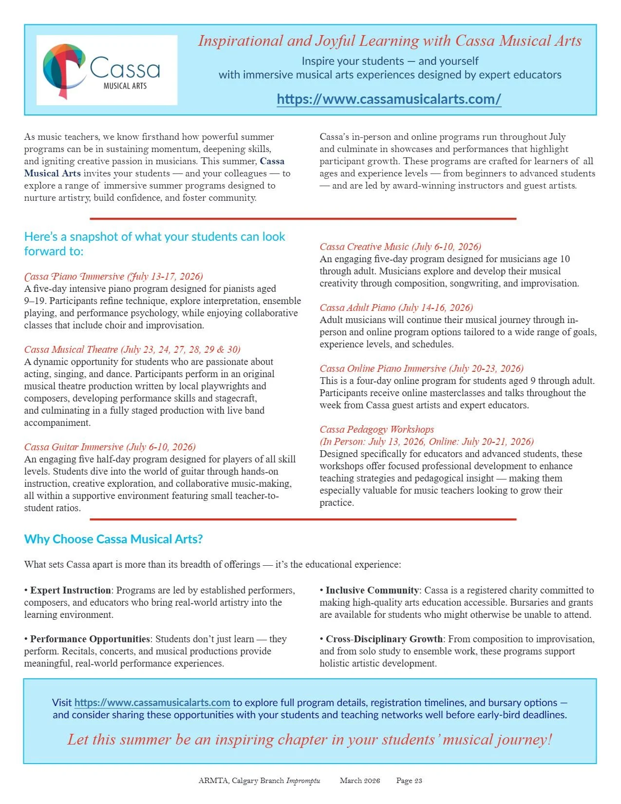 The Alberta Registered Music Teachers Association (ARMTA) has been a strong supporter of Cassa Musical Arts since our inception in 1993. Over the years, this relationship has helped strengthen music education in our community and provided meaningful opportunities for both our instructors and students.