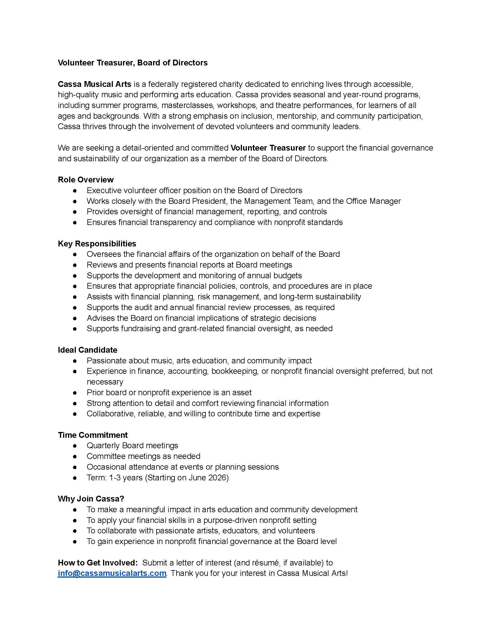 Do you believe that music has the power to connect, inspire, and transform communities? Are you passionate about supporting artists and expanding access to the musical arts? If so, we invite you to consider joining the Cassa Musical Arts Board as our next Treasurer.